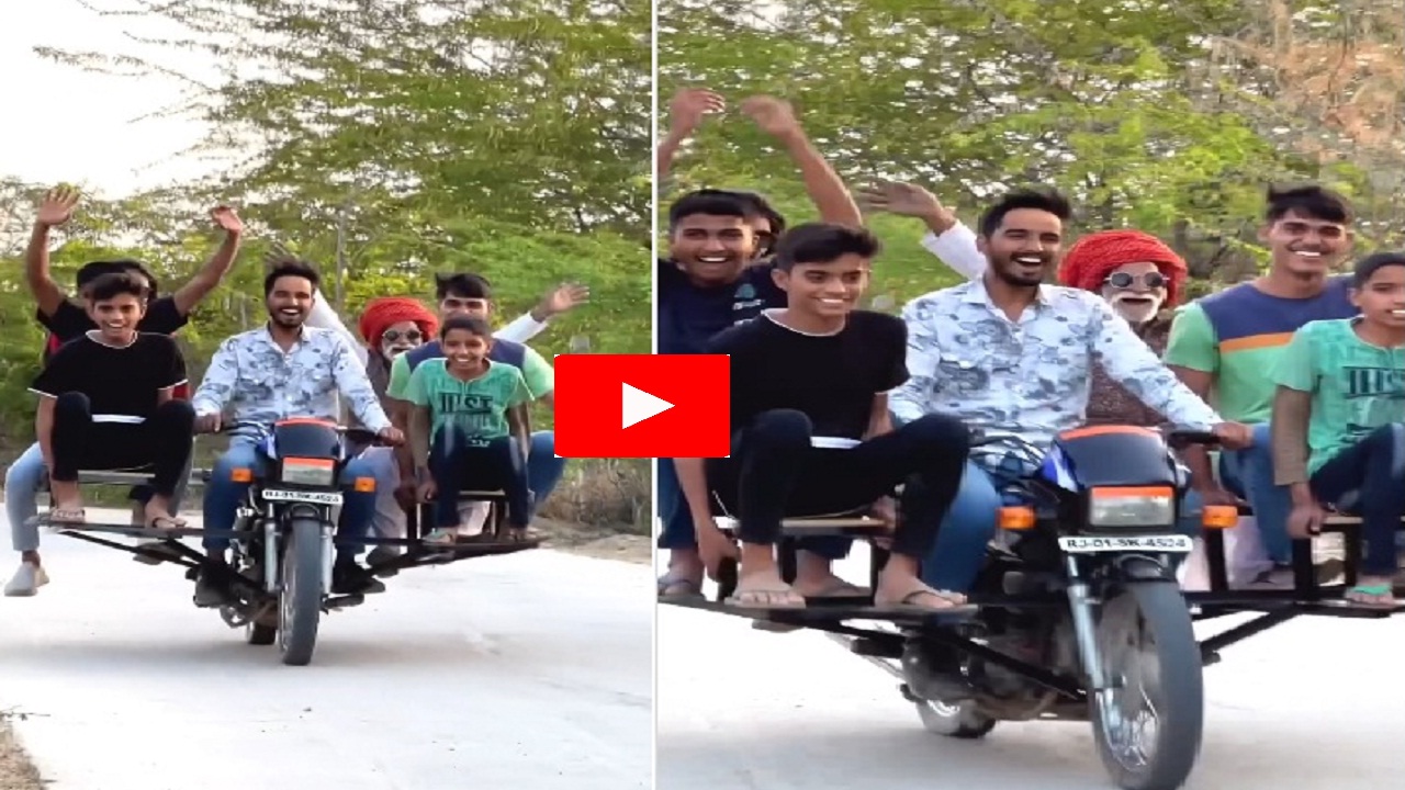 आपको बता दें की वर्तमान में सोशल मीडिया पर एक वीडियो काफी देखा जा रहा है। वीडियो में आप देख सकते हैं की एक शख्स ने अपनी बाइक के दोनों और लोहे के स्टैंड लगाए हुए हैं। इनको ही युवक ने सीट का आकार दिया हुआ है। वीडियो में देखा जा सकता है की युवक बाइक चला रहा है और उसके दोनों और तीन तीन लड़के बैठे हुए हैं। इस प्रकार से एक ही बाइक पर कुल 7 लोग बैठे हैं। यह वीडियो इस स्थान का है यह तो पता नहीं लग सका है हालांकि वीडियो देखकर लगता है की यह कोई ग्रामीण क्षेत्र हैं।